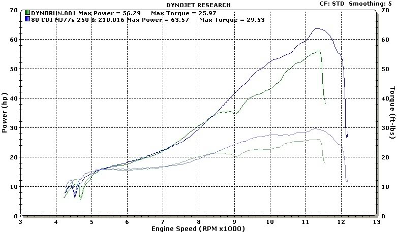 The blue trace is a stock MC18, the red trace is the same bike with a soldered wire, and the green trace is the 3XV with ported barrels, skimmed heads, ported cases, modified airbox, race pipes, race CDI, etc.